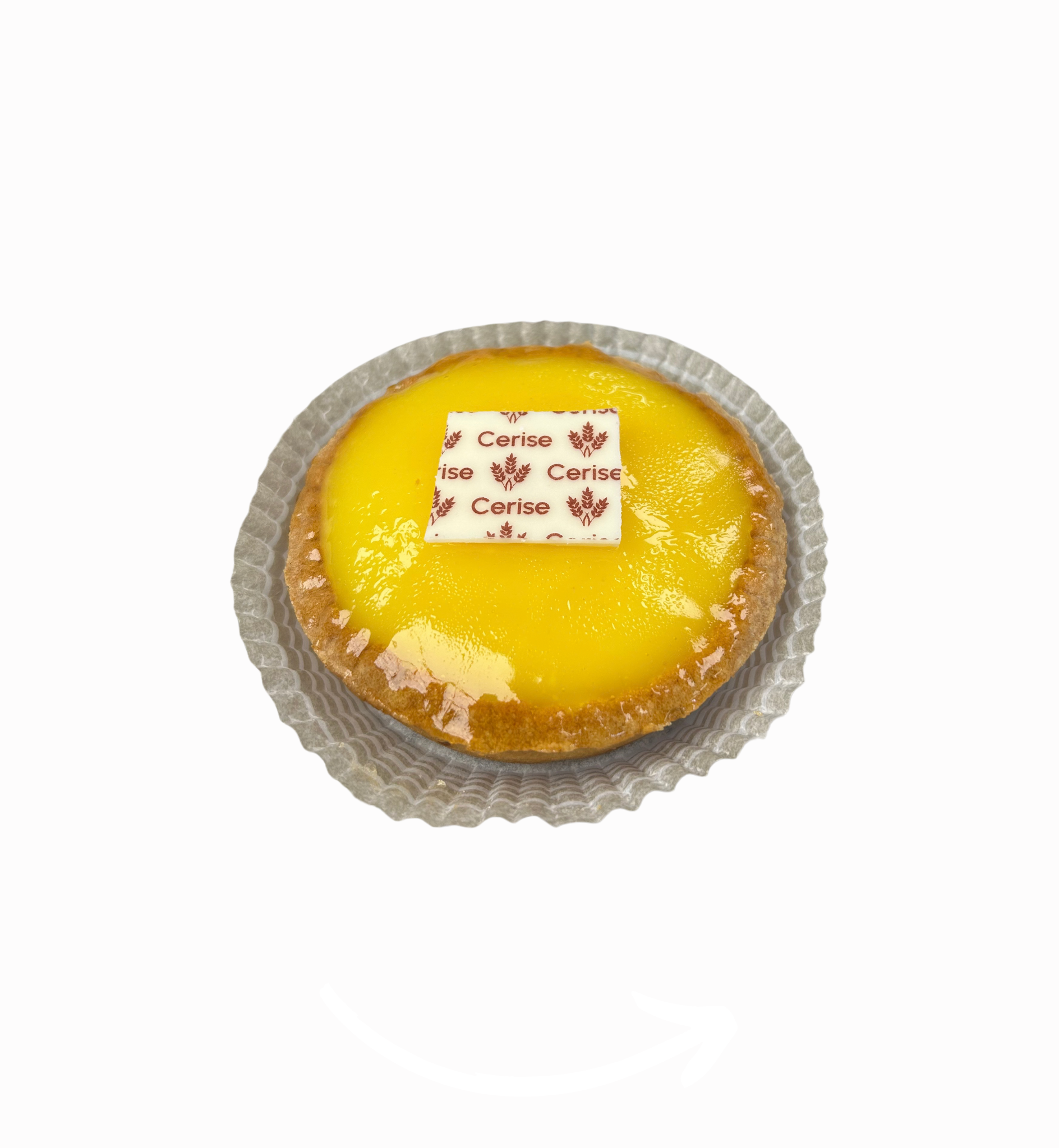 Lemon curd fills a sweet pastry crust, topped with a square of white chocolate.
